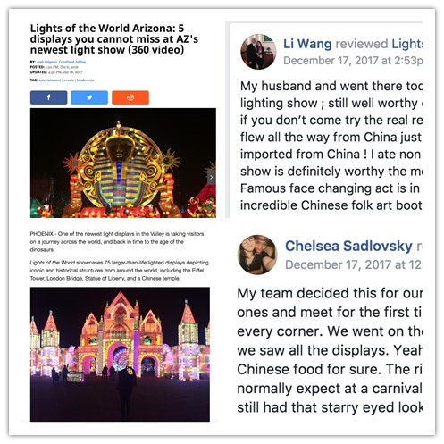 本次燈展是東方彩燈繼2016第一次成功舉辦美國(guó)菲尼克斯彩燈嘉年華的再次完美呈現(xiàn)。2017美國(guó)菲尼克斯彩燈嘉年華,自開(kāi)展以來(lái)備受美國(guó)當(dāng)?shù)孛癖姛崤鹾透鞔笾髁髅襟w關(guān)注、在facebook等社交平臺(tái)更是掀起了中國(guó)彩燈熱潮,菲尼克斯當(dāng)?shù)匦侣劇?Now @ 6 》報(bào)道稱(chēng)“2017世界之光彩燈嘉年華是北美最大的彩燈節(jié),是全球文化集合地,游客仿佛置身于迪士尼中?!?