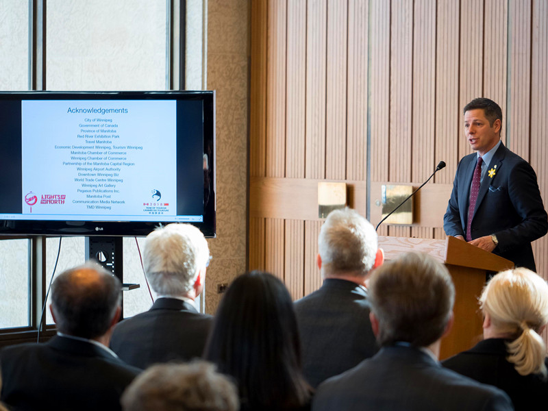 溫尼伯市市長BRIAN BOWMAN發(fā)布會上誠邀天下客,共賞東方燈,他說:“北境之光——溫尼伯中華彩燈嘉年華”是“2018中加旅游年”的重頭戲,我們非常期待本次活動,屆時悠久璀璨的中華文明將帶給加拿大民眾一場神奇的光影之旅,也誠摯邀請各國游客來溫尼伯做客。在4月5日召開的曼省議會上專題介紹了本次燈展,并對燈會給予了高度評價。會上全體省議員集體起立,為燈展項目鼓掌一分鐘。