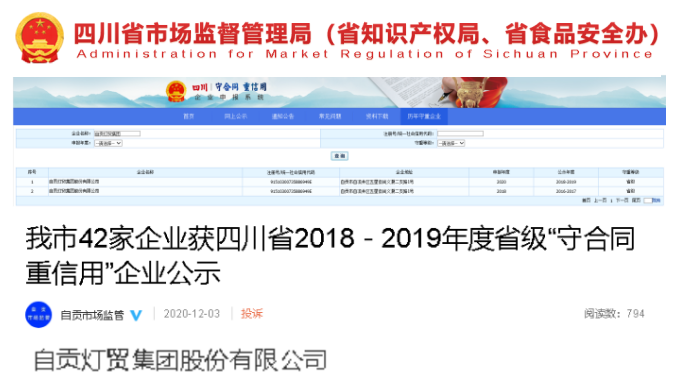燈貿(mào)集團以良好的企業(yè)信譽和社會口碑,榮獲四川省市場監(jiān)督局管理局頒布的2018-2019年度四川省“守合同重信用”企業(yè)稱號。