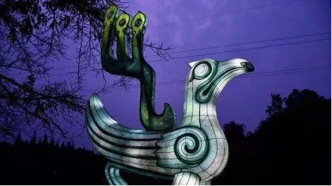 入口兩側(cè)(橋外側(cè))處,設置了兩只相似但不相同的鳳鳥燈組立于入口兩側(cè)通道處,高2.8米。以青銅鳳鳥為設計原型,鳥與蜀族之關系極為密切,三星堆館藏文物中有眾多的鳳鳥形器物及紋飾圖案。