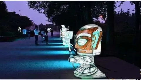 在主干道兩側(cè),各有一排青銅人像燈組,此處燈組復刻了三星堆祈福神官主題盲盒中的青銅人物形象,其中,有大家所熟知的青銅大立人像、雙手合十許愿狀的青銅戴冠縱目面具、平頭與圓頭的“金面使者”等,造型獨特,形象鮮明。融入現(xiàn)代藝術設計卡通Q版形象,加入活潑可愛的人物性格,使文物生動起來。