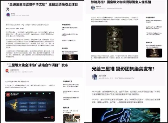 截至52910點(diǎn),各大主流媒體紛紛推出《光繪三星堆 攝影圖集絕美發(fā)布!》《揭開古蜀國神秘面紗 走進(jìn)三星堆體驗(yàn)博物館奇妙夜》《新出土千余件重要文物后 三星堆吸引中外媒體讀懂中華文明》《三星堆國寶文物銅頂尊跪坐人像亮相!》《“三星堆文化全球推廣戰(zhàn)略合作”9大項(xiàng)目正式發(fā)布》等新聞報(bào)道。