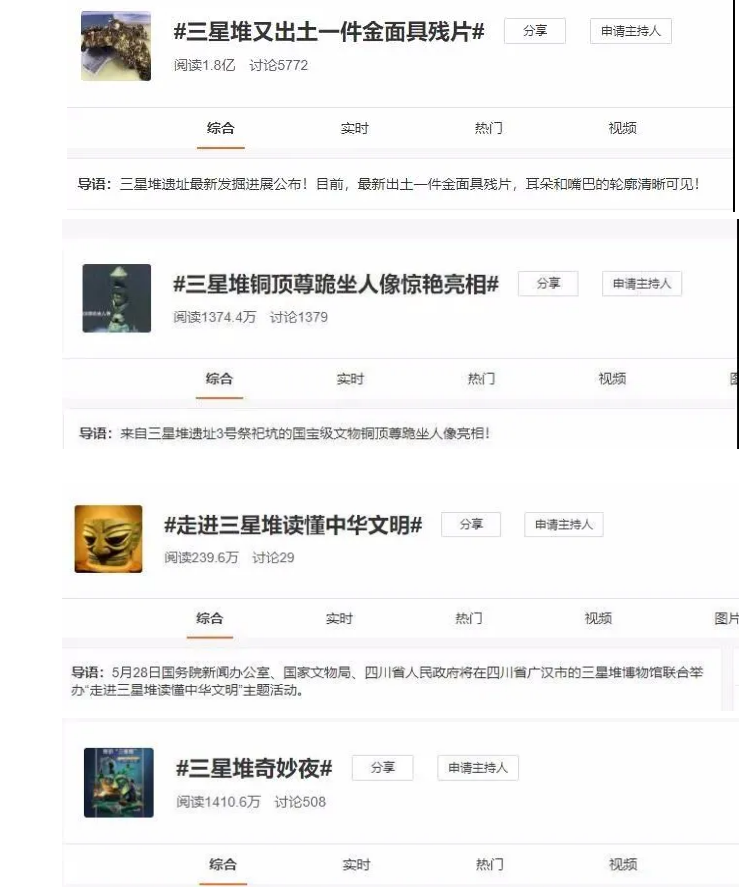新浪微博話題 #三星堆又出土一件金面具殘片##三星堆銅頂尊跪坐人像驚艷亮相# #走進(jìn)三星堆讀懂中華文明##三星堆奇妙夜##三星堆奇妙夜直播#等相關(guān)話題累計(jì)閱讀量都很高!