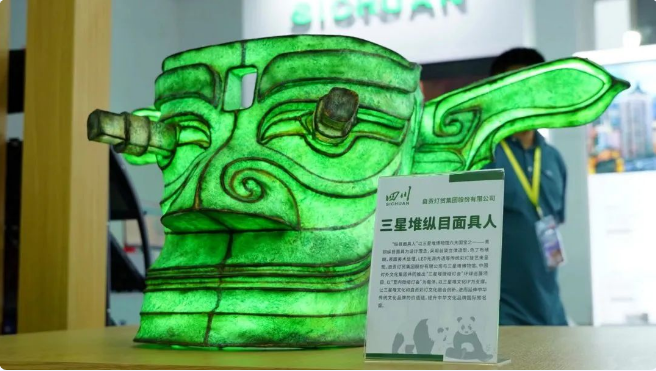 本屆青洽會(huì)中,四川館以“激情大運(yùn)·魅力四川”為主題,分設(shè)“激情大運(yùn)”“特色科技”“三星堆文創(chuàng)”“川貨出川”四大展區(qū)。自貢燈貿(mào)集團(tuán)股份有限公司的最新微縮彩燈工藝產(chǎn)品——“三星堆縱目面具人”亮相青洽會(huì),攜手其他特色文創(chuàng)展品共同生動(dòng)展現(xiàn)四川風(fēng)采。